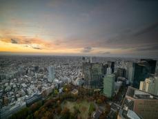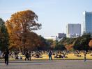 Mittags im Park in Tokio gibt es zwischen dem Herbstlaub jede Menge Durchblicke auf Wolkenkratzer!
